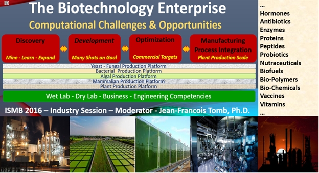 The goal of the industry session is to provide the ISCB community with first-hand knowledge of the computational opportunities and challenges from leading companies in Industrial Biotechnology (IB). We have invited representatives of IB companies who span the spectrum of the Biotechnology Enterprise as illustrated below.
