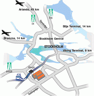 A: The most convenient method of travel is by train from the Stockholm Central station. A map can be viewed at: http://www.stockholmsmassan.se/common/category.aspx?id=493